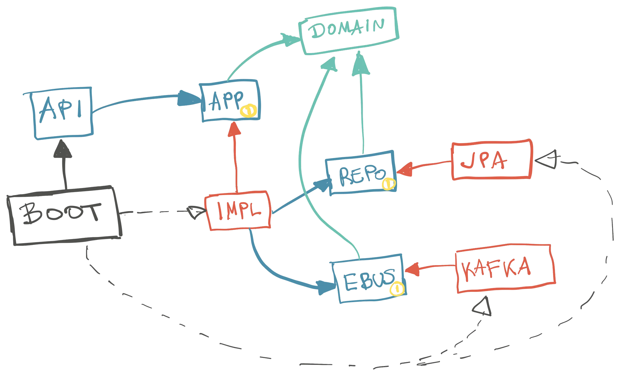 AppImplzavisi odRepo, a ne odJPA(crvene kućice zavise od plavih, a ne od drugih crvenih).